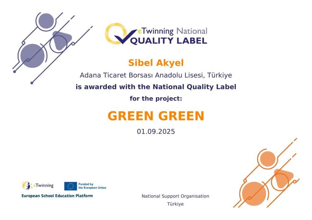 Okulumuz İngilizce öğretmeni İnci GİDER’in ve Almanca öğretmeni Sibel AKYEL’in yürütmüş olduğu Green Green isimli etwinning projemiz ulusal kalite etiketi almaya hak kazanmıştır. Emeği geçen tüm öğrenci, öğretmen ve öğrencilerimize teşekkür ederiz.